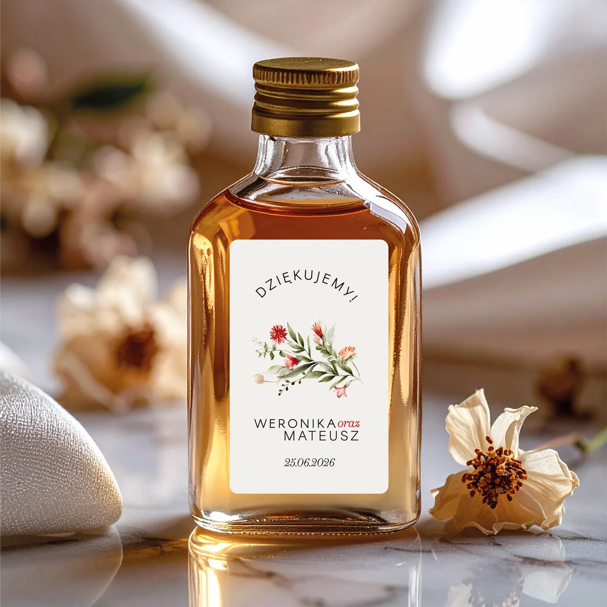 BUTELECZKA Z NAKLEJANĄ PERSONALIZOWANĄ ETYKIETĄ JAKO PODZIĘKOWANIE DLA GOŚCI WESELNYCH